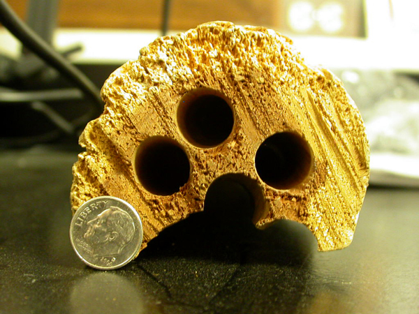 Carpenter bees are solitary insects that emerge in April or May. The female carpenter bee bores into soft wood, leaving a hole that is almost half an inch in diameter. She tunnels in for one inch, against the grain, before turning 90 degrees to tunnel with the grain. She usually will build between six and eight brood chambers in her nest. She mates in the spring before returning to her nest to provision each of her brood chambers with a ball of pollen and regurgitated nectar. She then lays an egg on this ball before sealing off the chamber. At this point, she dies. The larvae then hatch, feed and emerge as adults in late summer before returning to the nest to hibernate. Misconceptions