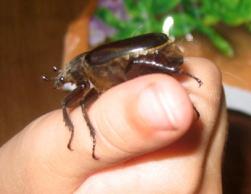 Hermit Flower Beetle One of the largest insects in Iowa is a scarab beetle (Junebug) called the hermit flower beetle (Osmoderma eremicola). The adult beetles appear in July and August and are about one inch long and dark brown to mahogany brown in color. The hermit flower beetle is similar in general appearance to the typical Junebug except that it is not quite as oval and it is flat on the top. The beetles are strongly attracted to lights at night and are frequently discovered in a wide variety of situations. The adults are harmless and no control is needed. |